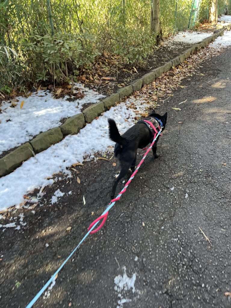 「寒くないの?」「冷たくないの?」と何度も聞いてしまう飼い主をよそに、本人(本犬?)はご機嫌で、時には小走り、時には立ち止まってのクンクン活動に大忙し。